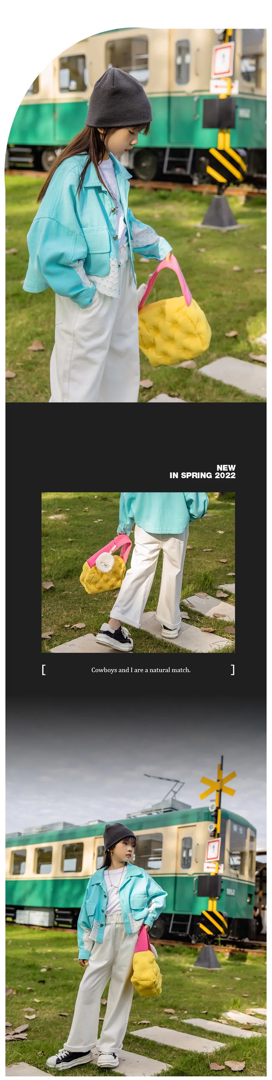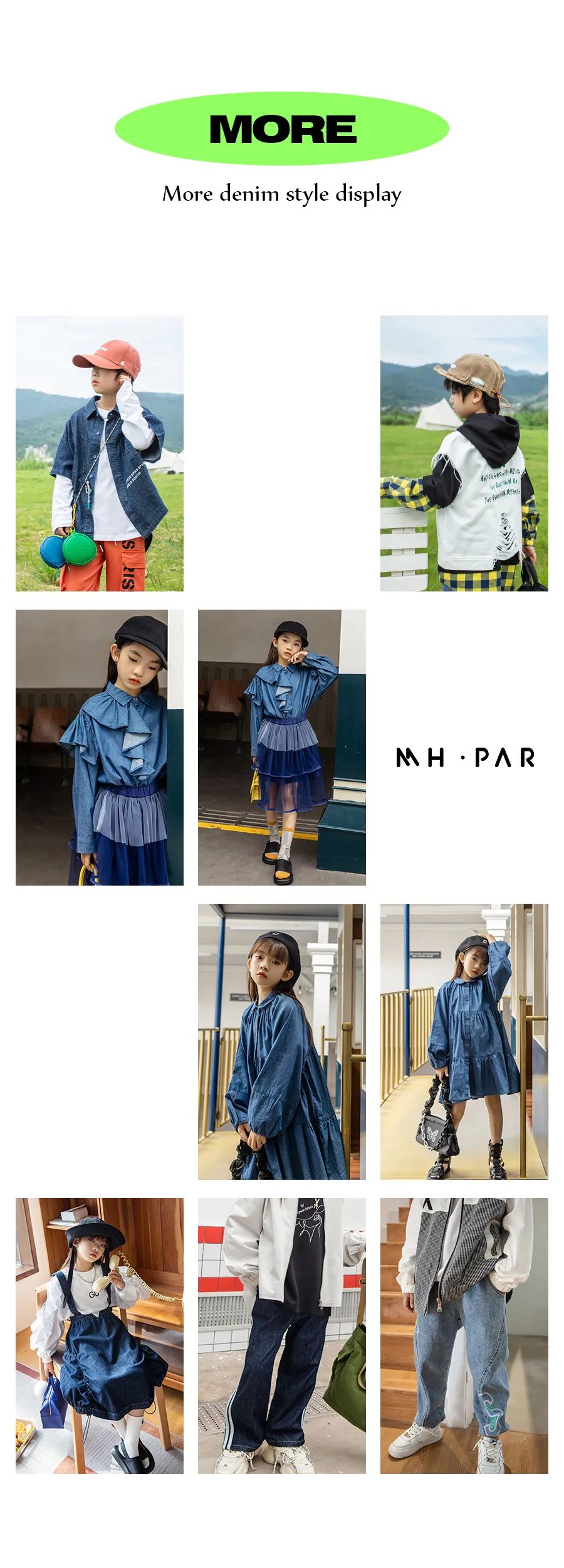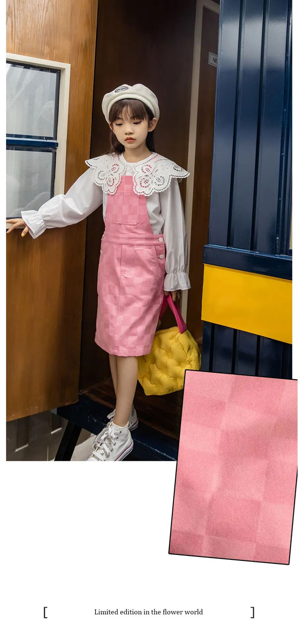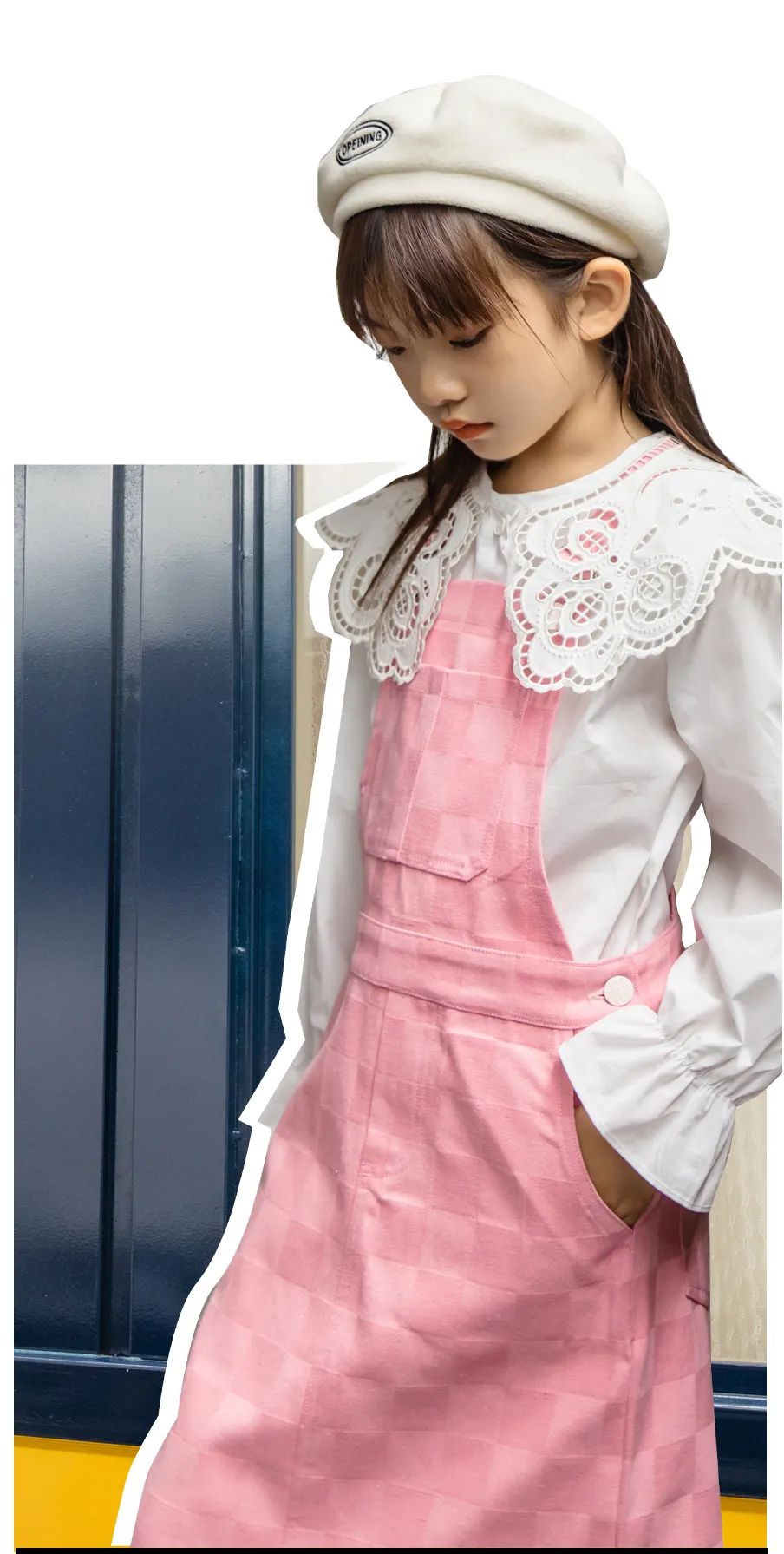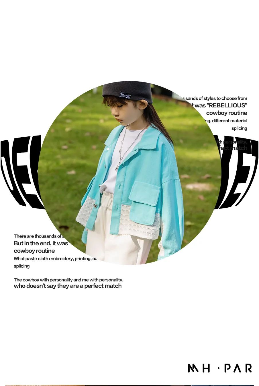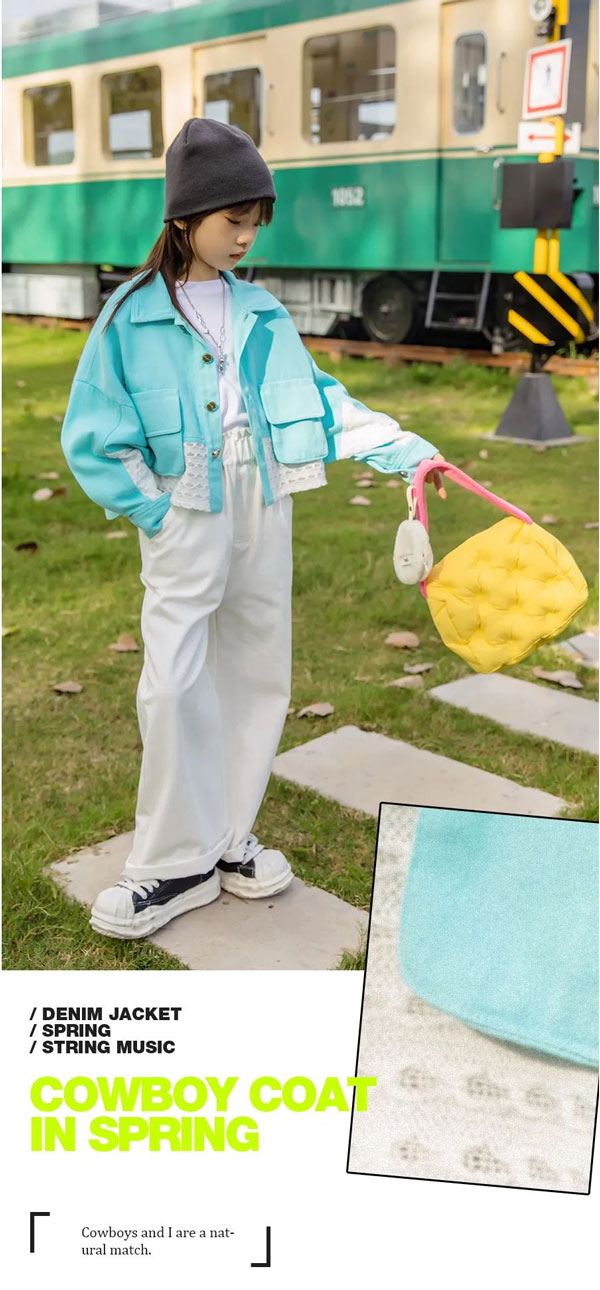 明亮欢快的湖蓝色牛仔拼接白色搂空面料