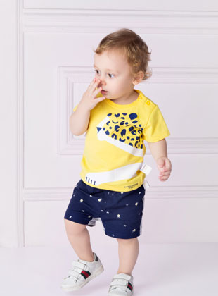 有了外套,内搭当然也少不了。哇喔森堡童装的这件T恤以黄色为底色,在上面加上了蓝色的不规则花纹,个性感十足。穿着这样一件T恤去郊游,想必回头率绝对百分百!