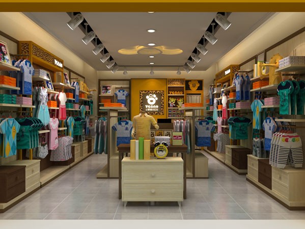 从店铺的一角望去,可以看到店内的产品分为货柜、货架等多种方式摆放。这样的陈列设计,可以让消费者自由来去,并准确找到属于自己的那一款童装。