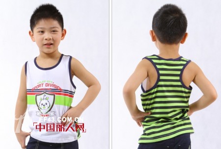 卡通的背心,中间以线条铺陈,充满了童趣。在背部又是完全另外一番景象,蓝绿色的条纹,给人以反差的对比,给童装增加了一丝潮流的气息。