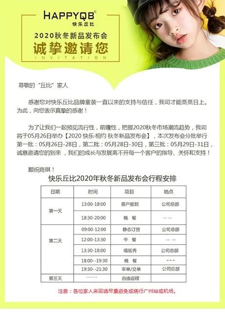 真诚的欢迎您前来参加快乐丘比童装品牌2020年秋冬订货会现将此次订货会的会务流程表提交给您以便您更充分的参与并预祝您此行取得圆满成功!