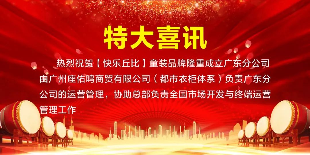 【快乐丘比】童装品牌隆重成立广东分公司 由广州座佑鸣商贸有限公司(都市衣柜体系)负责广东分公司的运营管理,协助总部负责全国市场开发与终端运营管理工作。