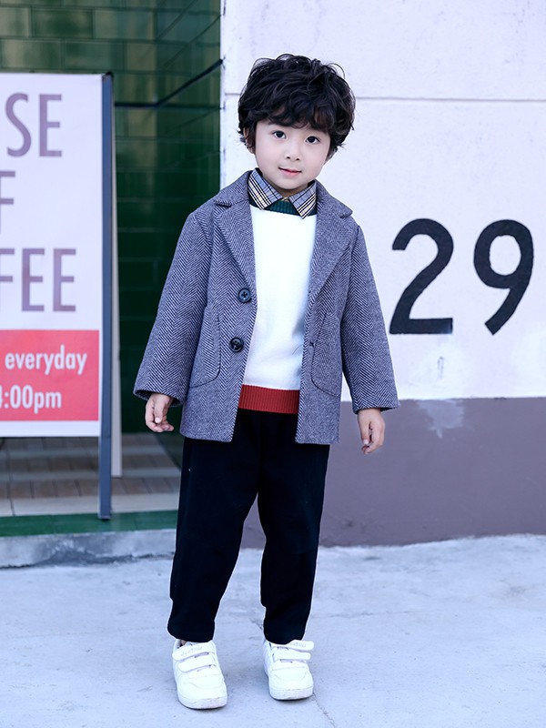 帅气的短款大衣能够为孩子的搭配增添几分英伦气息。快乐丘比这件男童灰色的短款大衣,采用经典的西装翻领设计,融入条纹感的纹理,穿着起来不仅不老气,还显的非常的帅气有型。搭配上浅色系的针织衫或是毛衣,配上一条黑色的裤子+一双小白鞋,总之不仅保暖而且时尚哦!