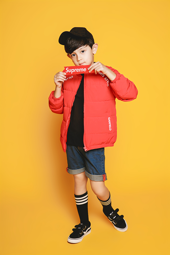 经典的面包服一直是小潮童的心水款,简约大气的宽松版型搭配活力满满的鲜亮红色,过年要潮当然得穿上加菲猫童装的这一件!
