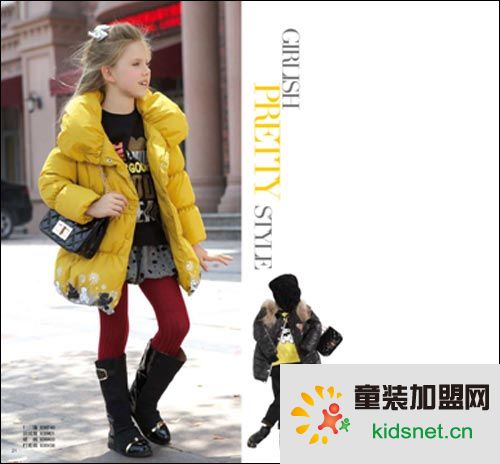 宽松的黄色羽绒服,独具个性的领子设计,充分的保暖,搭配以暗红色的丝绒裤,黑色的皮包,黑色靴子,也是一种和谐之美,这样的设计不但让孩子显得更加的时尚活泼,而且也展现了童趣般的气息。