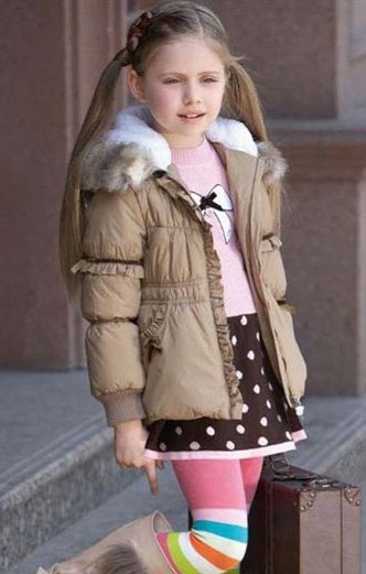 浅褐色的羽绒半长大衣,再度体现了柏迪小熊舒适至上的理念,羽绒材质轻巧而温暖,胳膊处及腰线上的收紧设计让羽绒大衣完全没有臃肿的感觉。大植绒衣领的设计使戴上毛绒风帽时毛绒的部分不会直接刺激到耳朵和脖子,植绒的柔软让孩子更加温暖和舒适。风帽外沿采用毛绒衬里,显出孩子的可爱与天真的同时,又可以抵御寒冷的风霜雨雪。