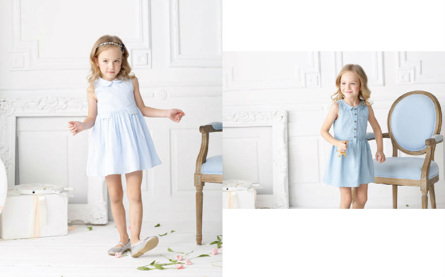 牛仔无袖连衣裙,纯色设计多了一种干净、活泼气息,翻领给裙子添加精致的点缀,伞型让小女孩有更多的时尚感,公主范尽显。