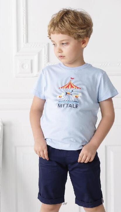 夏天T恤短裤再常见不过啦,但是短袖T恤穿好了也能穿出感觉哦,这件简单的蓝色小短T,衣服正中央有个旋转木马的小印花,简单但是充满了童趣~~