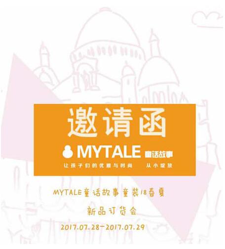 MYTALE童话故事童装2018春夏订货会将于2017年07月28日-07月29日在深圳龙华大浪默根创意园B栋12楼隆重开启,欢迎国内各省的核心代理商、经销商赶赴订货会现场,我们邀您一起共享这场时尚盛宴!