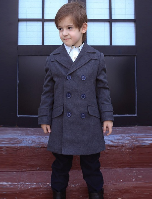 西装外套我们需要选择,呢子外套也同样不能缺少,双排扣的呢子外套,翻领的设计,中长款的版型有点韩国欧巴风格,小孩子也可以这么帅气哦,呢子外套选择深色系的比较的百搭,内搭可以清新的白色衬衫,也可以毛衣。
