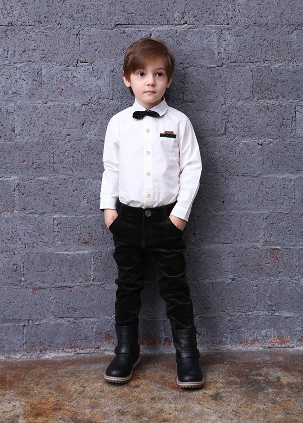 蓝蚁迪堡童装男童丝绒裤子搭配,黑色丝绒裤搭配,丝绒的裤子内搭黑色的颜色有点小反光的感觉特别的有档次,上衣配上一件白色衬衫,衬衫是比较百搭的款式。简约又大方,配上一个领结小男孩穿必定很耐看。