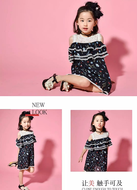盛夏季节中,性感露肩元素是提升小女人味的法宝!雅致的白色蕾丝紧贴着仙气满满的众花图案,层层修饰,微露的小肩,有一种娇羞柔美又不失梦幻清新的感觉,半扎的丸子头上镶嵌一颗小珍珠,小黑凉鞋中央的花,这所有的搭配会给人一种娇柔小女人的感觉,爸爸们看见上辈子的小情人这样的装扮会有什么感谢呢?
