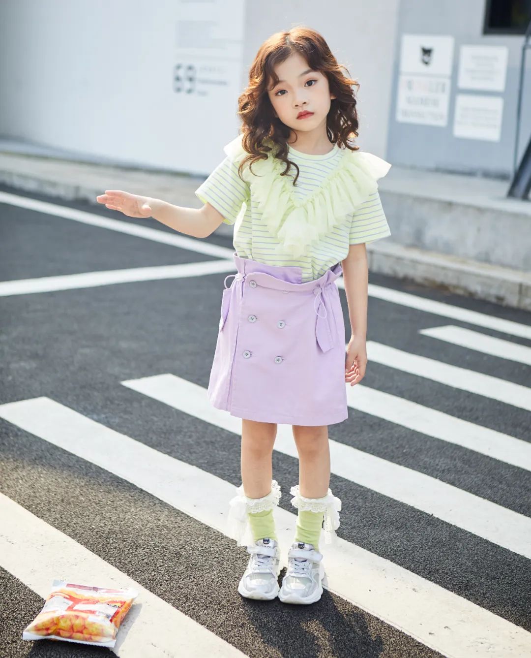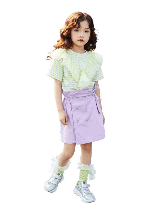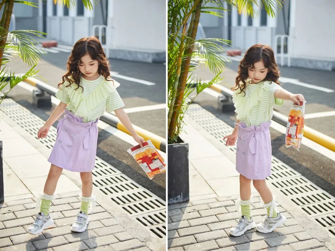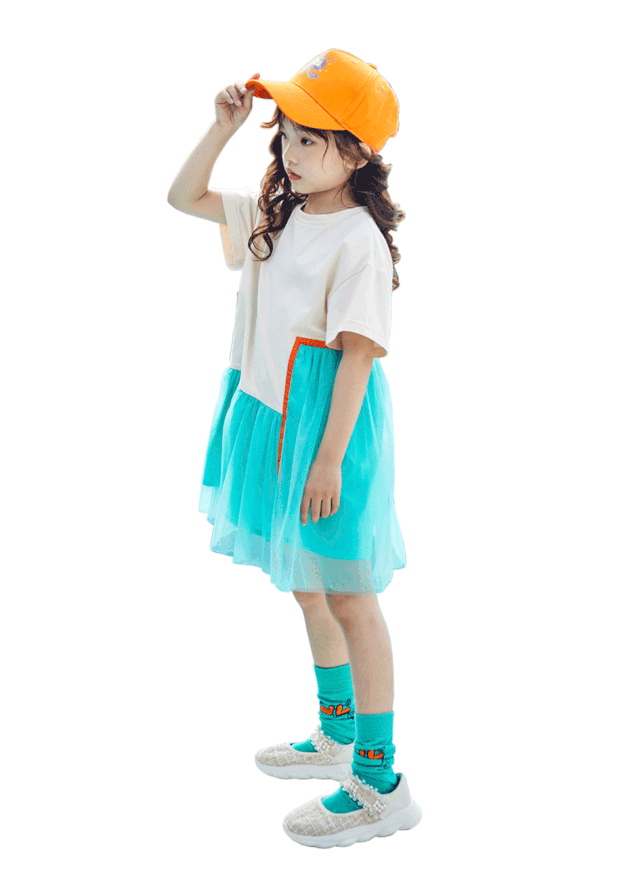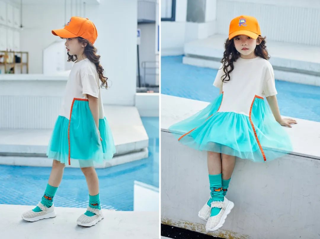 大V字形的甜美网纱拼接,让整件短袖兼具甜美与浪漫、女孩儿的气质;花苞形状的松紧裙腰设计,轻松调节,穿着时如同绽放的可爱花朵。