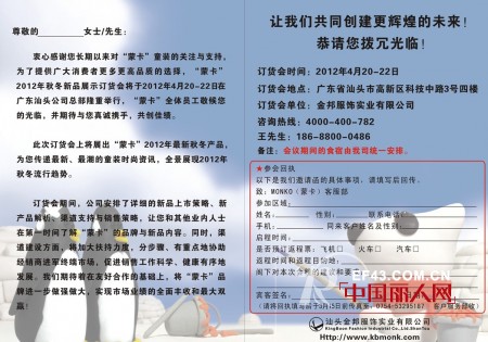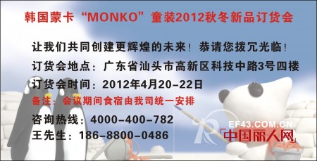 衷心感谢您长期以来对“蒙卡”童装的关注与支持,为了提供广大消费者更多更高品质的选择,“蒙卡monko”2012年秋冬新品展示订货会将于2012年4月20-22日在广东汕头公司总部隆重举行,“蒙卡”全体员工静候您的光临,并期待与您真诚携手,共创佳绩。