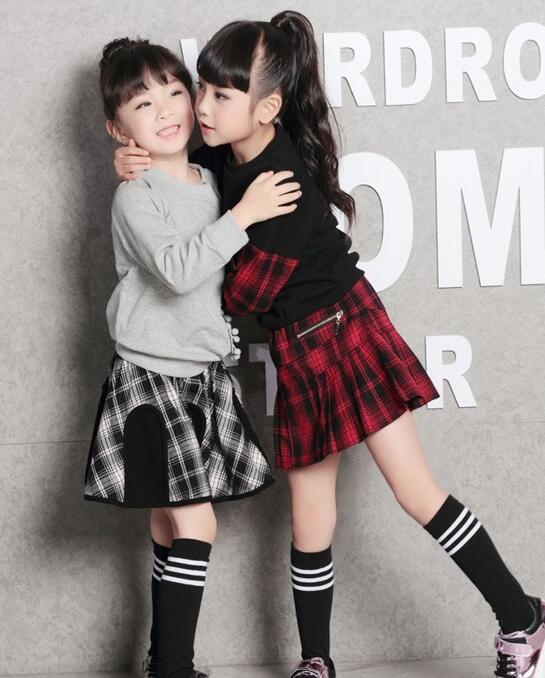 格子的衣服除了连衣裙还可以是半身裙,红色格纹的套头衫款式,袖子是拼接的版型非常个性,下身也是红黑格纹的半身裙的款式,百褶裙的版型非常的可爱,冬季可以当做内搭,而春秋季单穿也很不错,配上短款外套更为吸睛。
