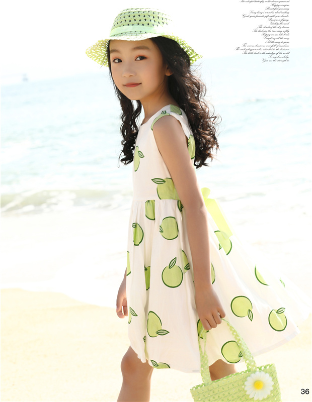 童趣的印花连衣裙,简单的白色在绿色清爽的苹果图案下变得绚烂可爱了起来,圆领设计显脖颈之美,下摆采用不规则设计有着错落有致的视觉美感,全棉的面料,正适合这个炎热的季节。
