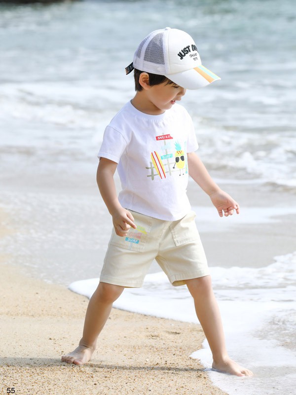 男孩子不像女孩那样复杂,但简单不代表随意,男孩也要给他最好的,对于男孩子来说,夏天最清爽简单的穿着就是T恤配短裤了,白色是夏季最散热的色调,胸口加入趣味十足的印花图案,简单而不单调,短裤选择米色系的,口袋的图案设计增添了时尚感,在这个炎热的夏天,要给孩子们最好的、最时尚的、最潮流的服饰,班吉鹿品牌童装一起陪伴孩子快乐成长!