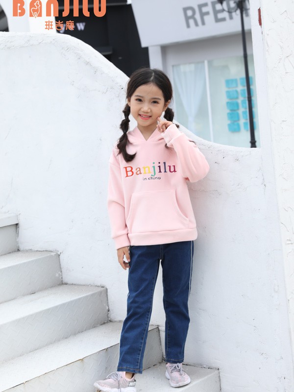穿搭要凸显出个人优势,家长可以尝试为女宝宝选择一款亮色系的卫衣,凸显出女宝宝的可爱感。班吉鹿童装品牌的这款粉色连帽卫衣,颜色甜美清新显白,连帽设计增添了造型的休闲感,中间增添了英文图案让造型更具时尚感,穿起来可爱有活力。下身搭配一条牛仔裤,率性时尚。搭配一双浅色系的运动鞋,动感时尚,呈现出了可爱有活力的女童穿搭!