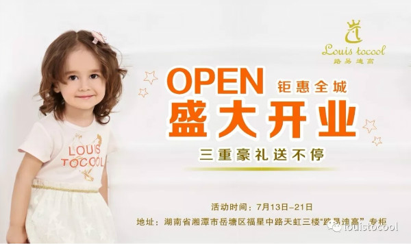 好消息!louistocool路易迪高7月又有新成员加入了!湖南省湘潭市岳塘区福星中路湘潭天虹商场三楼louistocool路易迪高专柜将于7月13日正式开业!预祝湘潭新店开业大吉,生意兴隆!