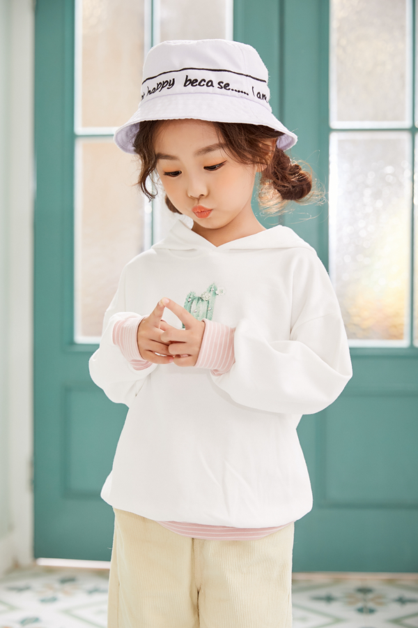 卫衣套装整体的时尚装扮,只要选对颜色,选对款式,就一定很时尚,这款纯白款式的卫衣套装,舒适又潮流的面料,让孩子穿上很有个性,纯白的套装点缀着仙人柱的时尚印花,以及粉色条纹的袖口和衣摆收边,不会显得单调,整体的感觉十分亮眼。