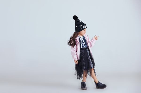 不规则的黑色纱裙,配上切尔西靴,整个人充满叛逆不羁的气息,粉色的夹克很好中和了这种张扬的个性,让宝贝显得俏皮又可爱。
