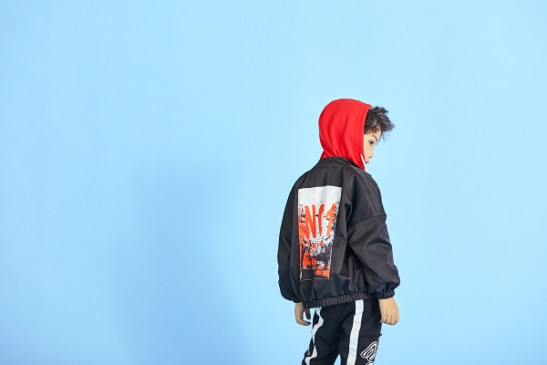 简单的涂鸦黑色外套,搭配红色的帽子,让整件衣服充满跳跃性。偏厚的设计,适合刚刚开春的时候穿着。