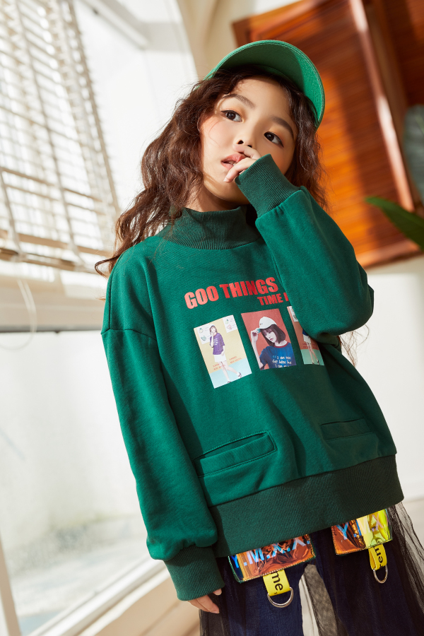饱和度更高的绿色卫衣在穿搭上带给人一种生机勃勃的感觉,正如孩子正在茁壮成长中一样,这一件卫衣穿搭呈现出孩子的健康成长状态,搭配上简约时尚的海报字母印花,让穿搭更时髦。