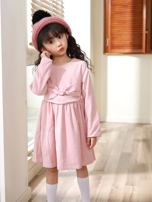 粉色连衣裙真的很好看了,圆领的设计露出锁骨将孩子的脸型修饰的很好看而且真的很可爱,腰间蝴蝶结的设计看起来很是唯美甜美,版型是那种很合身的穿在身上很是舒适简约,裙摆的设计彰显出孩子的可爱的天性,很适合在秋天穿哦,搭配一双小白鞋整体的造型甜美优雅将可爱展现的淋漓尽致。