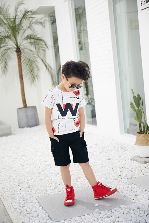 白色T恤也是夏日常见的清凉选择,黑红色的印花图案时尚有型,与黑色极简短裤搭配起来非常合适,整体搭配清凉透气,帅气十足。红色帆布鞋的选择更是潮到不行,今夏一定不能错过。西瓜王子童装清爽上新,快来选择你想要的时尚搭配!