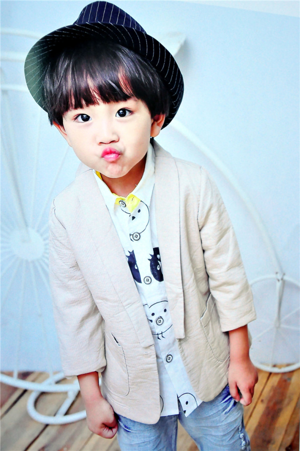 而西装外套也是很不错的选择,的纯这一件亚麻色的西装外套给孩子穿起来就是一个小绅士啦。搭配上的纯舒适可爱的内搭和凹造型必备的小礼帽就能够让你的宝贝足够出彩。