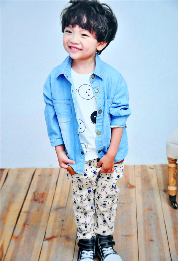 牛仔元素更显青春活力感,的纯这一件牛仔衬衫外套给孩子穿起来帅气又有型,搭配上白色的T恤和印花的白色裤装就能够在春日里足够吸睛了。