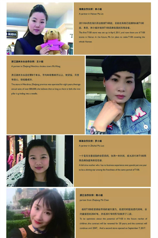 目前,T100已形成研发、生产和营销等三大模块为主体的经营体系并于2016年成功获得A轮融资,公司持续迅猛发展中。T100注重管理规范,相继通过ISO9001、ISO14001和OHSAS18001等体系认证,成为“广州市安全生产标准化达标企业”和“标准化良好行为AAAA企业”,以标准化和管理创新实现经营品质的不断提升,在北京、上海、广州、深圳、成都等各级城市主流商场与机场开设超过300家门店。
