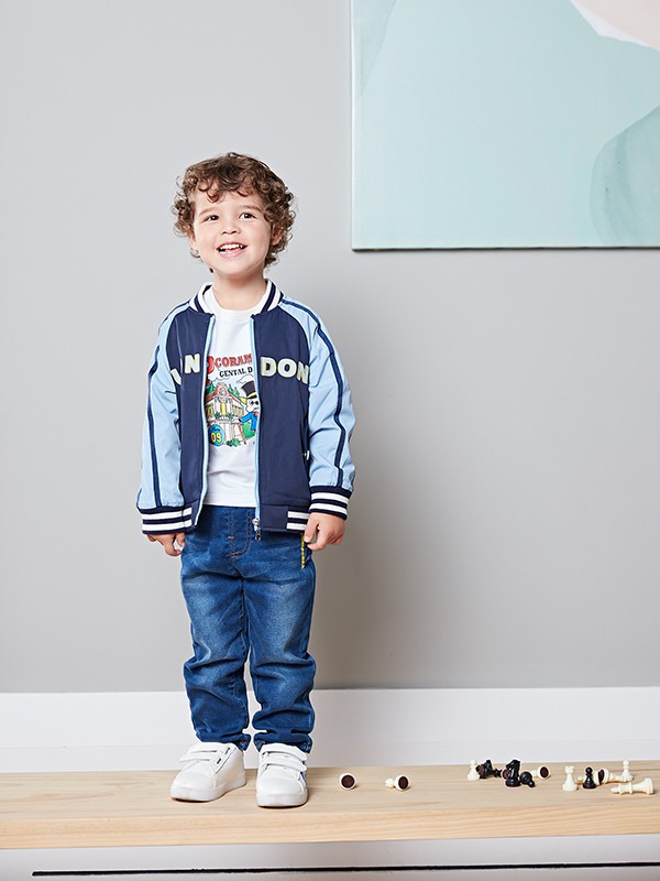男宝宝活泼好动,孩子们处于成长期,可以尝试为孩子们打造一身时尚的休闲造型。秋季一些薄款外套掀起了穿搭热潮,家长可以为男宝宝选择一件夹克外套,配色清爽耐看,版型休闲时尚,融入了英文图案让造型更具时尚感。里面可以搭配一件白色的打底衫,融入了个性的插画图案和英文图案让造型更具时尚感。下身给男宝宝选择一条牛仔裤,率性时尚!搭配一双小白鞋,呈现出时尚感的休闲造型!