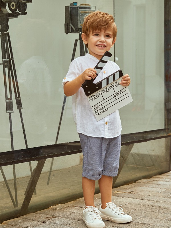 这款白色衬衣短袖看起来是不是很有绅士风范,翻领的设计简约大方很显气质的,而且白色的颜色干净温柔,版型是很合身的,纽扣的设计简约时髦,下身搭配一件灰色短裤,休闲的款式穿在身上舒适简约,短裤露出小腿部分,很显腿长哦,搭配一双小白鞋,整体的造型休闲有很帅气,穿在身上浓浓的小绅士风!