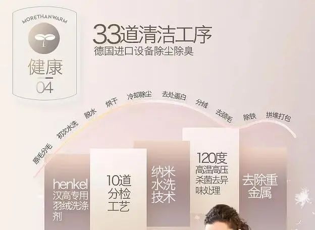 所有羽绒均经过洗涤、除臭、去脂、杀菌、消毒、烘干、冷却七个程序重复处理后方可投入生产,且均通过国家质量标准,其含绒量、蓬松度、气味等均达到国家行业标准。