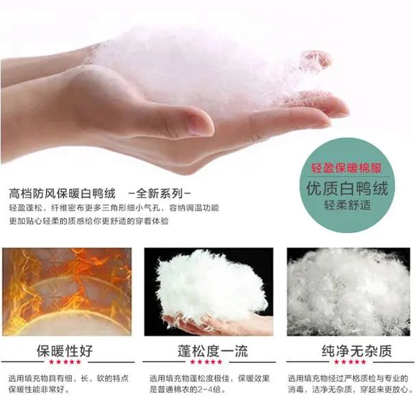 由于白鸭绒具有细、长、软的特点,因此蓬松度与保暖度非常好、巴柯拉童装90%白鸭绒在同样的充绒量下,保暖效果基本是普通羽绒服的2-4倍。