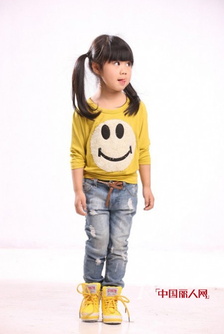 衣前的笑脸图案不但让自己穿出好心情,还能给周围的小朋友们带来无限的正能量,搭配磨破牛仔裤&柠檬黄运动鞋,简单的搭配是孩子们最好的选择。