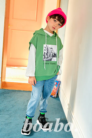 高品质的轻潮运动款搭配,舒适简约的白色长袖T恤,外搭厚实的绿色带帽卫衣,一条运动款休闲牛仔裤,帅气的男孩更加时尚有活力。暖春时刻,宝儿宝不止为全国宝宝带去时尚,更为武汉加油,为中国加油!