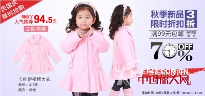 国庆十一长假前的最后一天,大家是不是很兴奋思密达?大家都带宝宝去哪里玩呢?节日的气氛愈演愈烈,国庆乐翻天,上海法娜妮服饰有限公司代表童装品牌法纳贝儿(Fanapal)、卡赛欧(Kasaiou)、伊诺贝儿(Enoubail)祝大家国庆节快乐!香港童装品牌卡赛欧在国庆期间主推四款大特惠,抓住时机,时尚就属于每位可爱的宝贝,快快与孩子一起分享衣饰风潮,加入时尚总动员的行列吧~