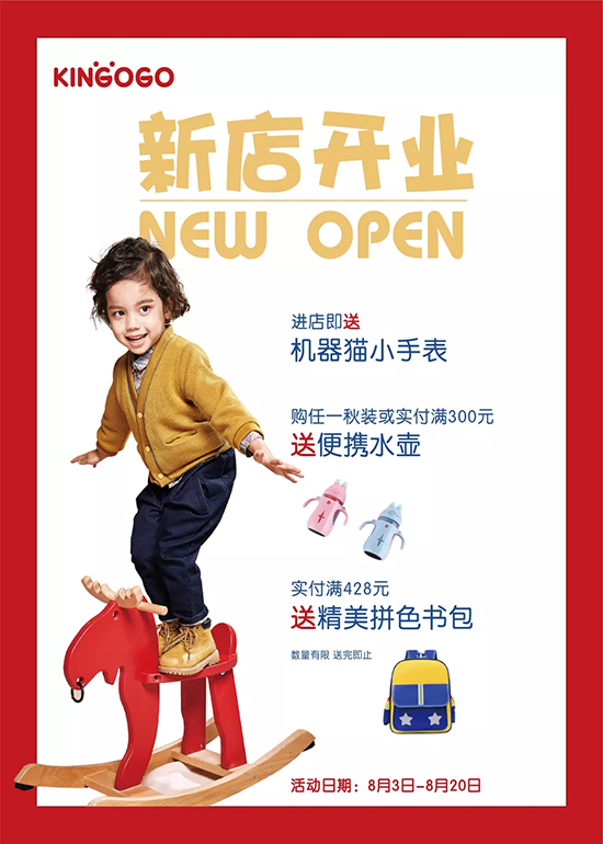 为回馈KINGOGO的果粉们,新店开业期间,进店即送机器猫小手表;购任一秋装或实付满300元,送便携水壶;实付满428元,送精美拼色书包;还有更多的开业优惠活动等你呦!