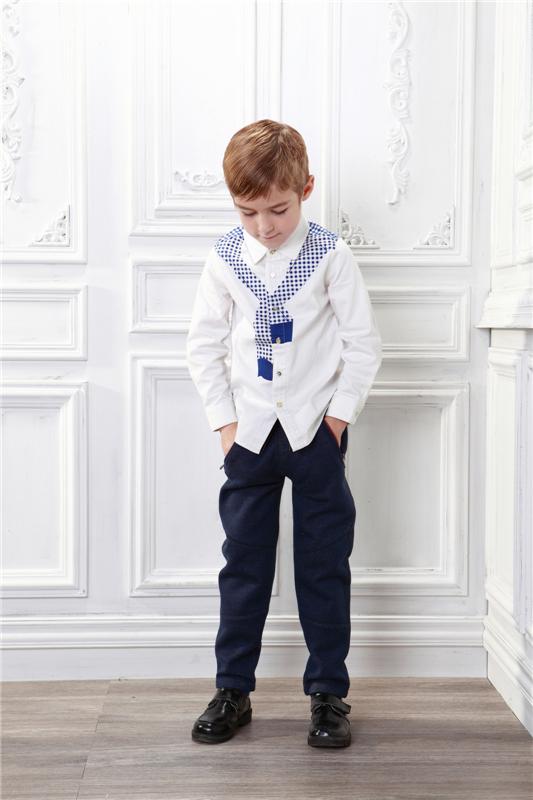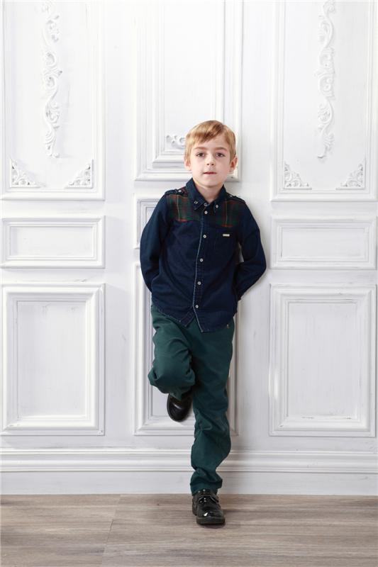 经典的衬衫款式,加上独特的格子印花,体现儿童成人化的优雅。搭配以休闲长款,彰显了男孩的帅气时尚。