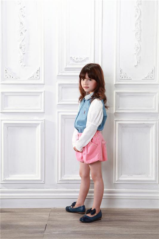 羊腿袖的设计,配以蕾丝的领口,完美地体现出英国贵族的宫廷感。下身搭配百褶裙,更显公主气质。灯笼短裤的裤型非常俏皮可爱,彩色的压线是整体不再单调。