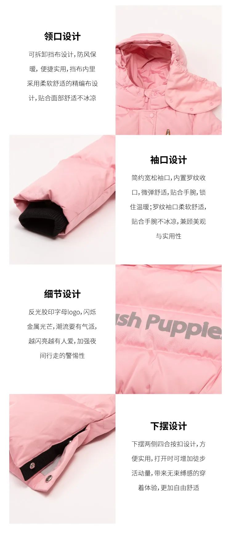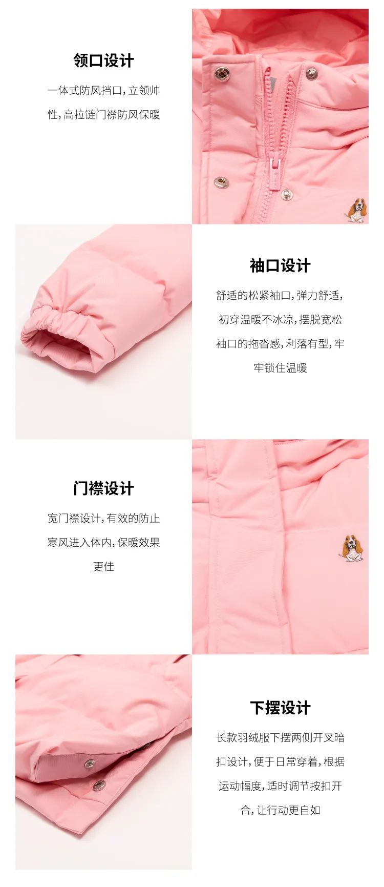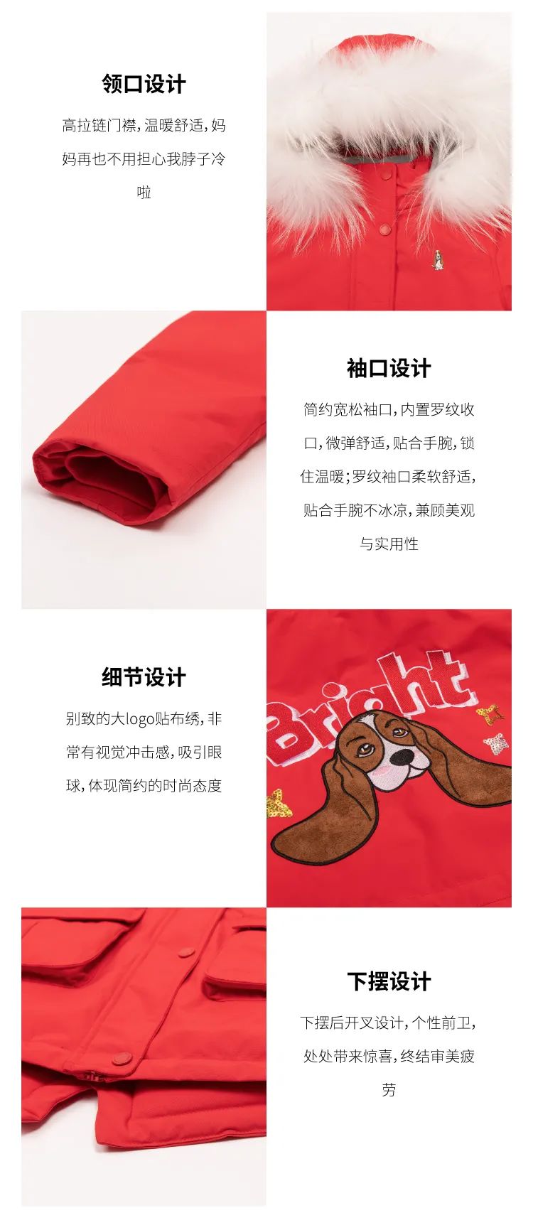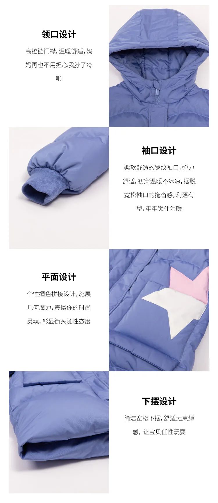长款羽绒服,更加保暖,双向拉链和短门襟设计,加大腿部活动量,孩子在户外运动时更加方便