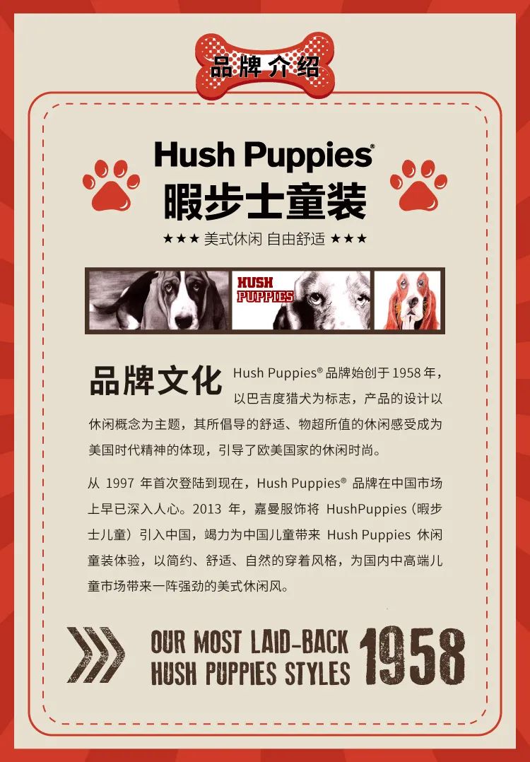 从1997年登陆到现在,Hush Puppies品牌在国内市场上早已深入人心。2013年,嘉曼服饰将Hush Puppies Kids(暇步士儿童)引入国内,竭力为国内儿童带来美式的Hush Puppies休闲童装体验,以简约、舒适、自然的穿着风格,为国内中高档儿童市场带来一阵强劲的美式休闲风。