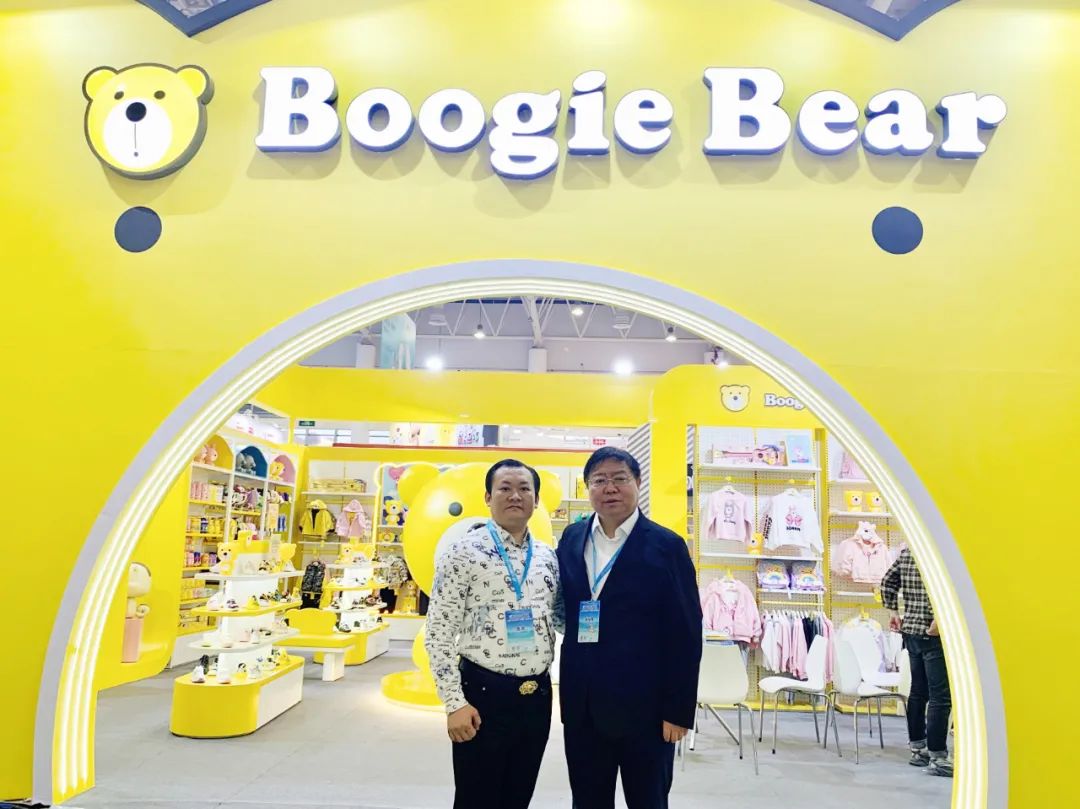 展会现场,大咖云集。中国广告协会会长张国华先生莅临Boogie Bear卜吉熊展馆指导,并与利讯集团董事长黄火明先生亲切合影。