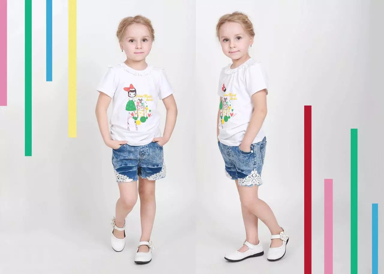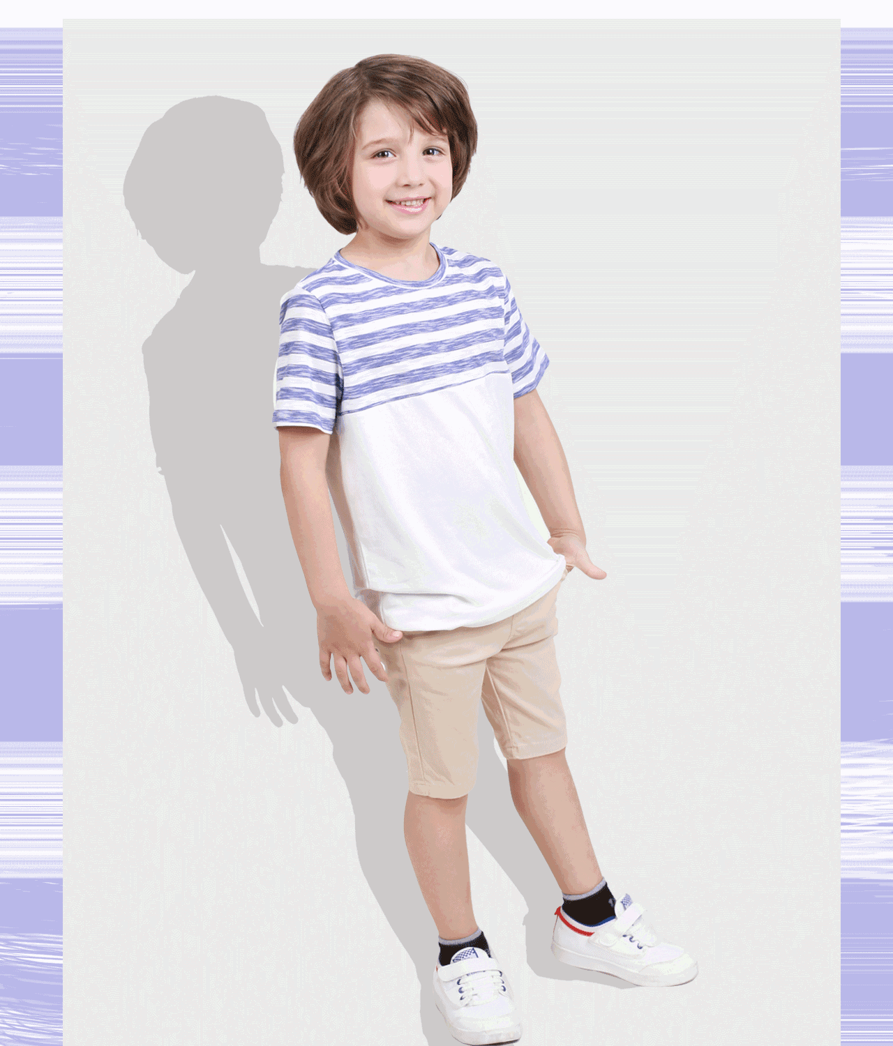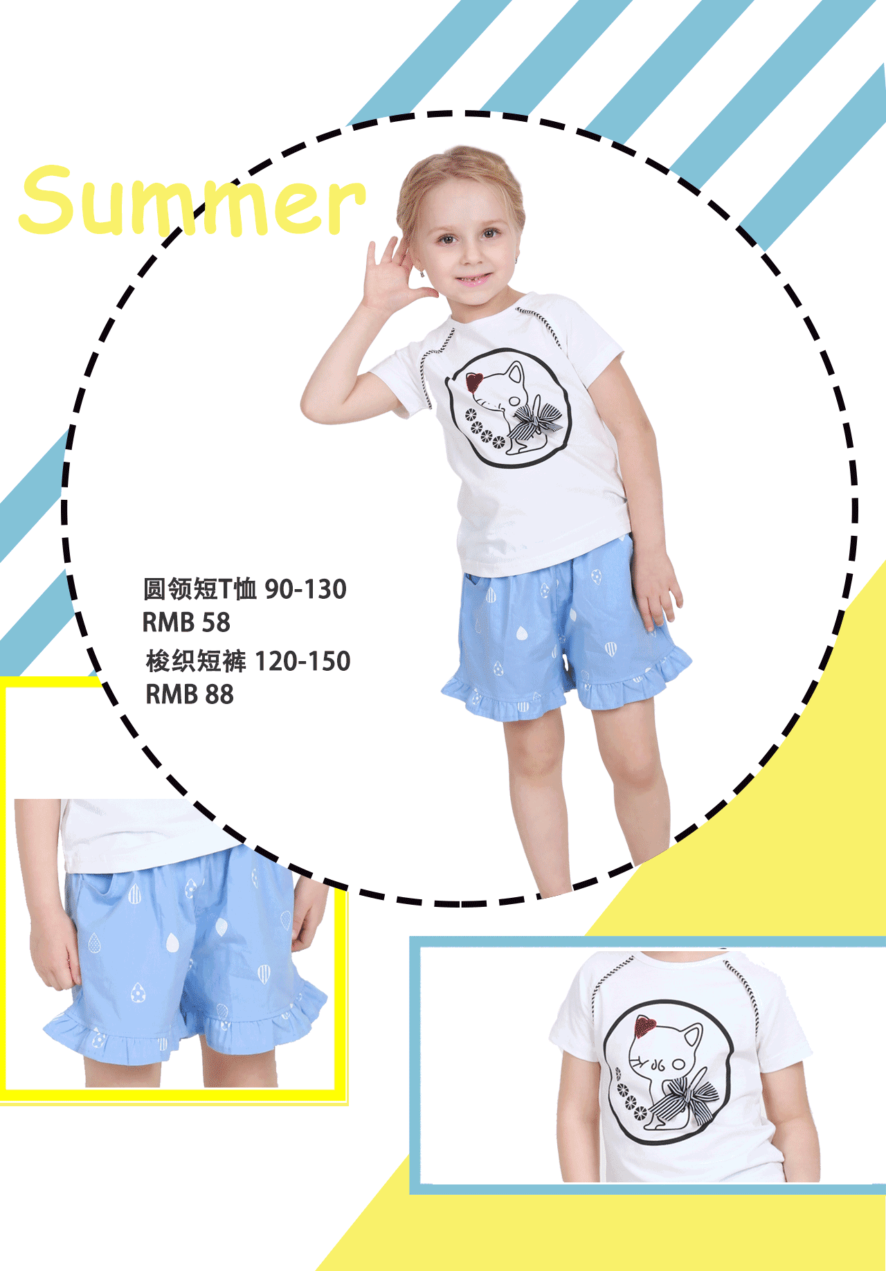 白色圆领T恤, 搭配蓝色梭织短裤,犹如蓝天白云,夏天的干净清爽,白色圆领T恤以及蓝色梭织短裤配以卡通图案,简洁不乏时尚潮流。