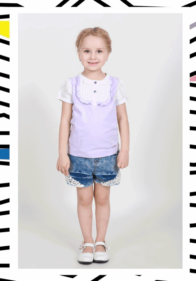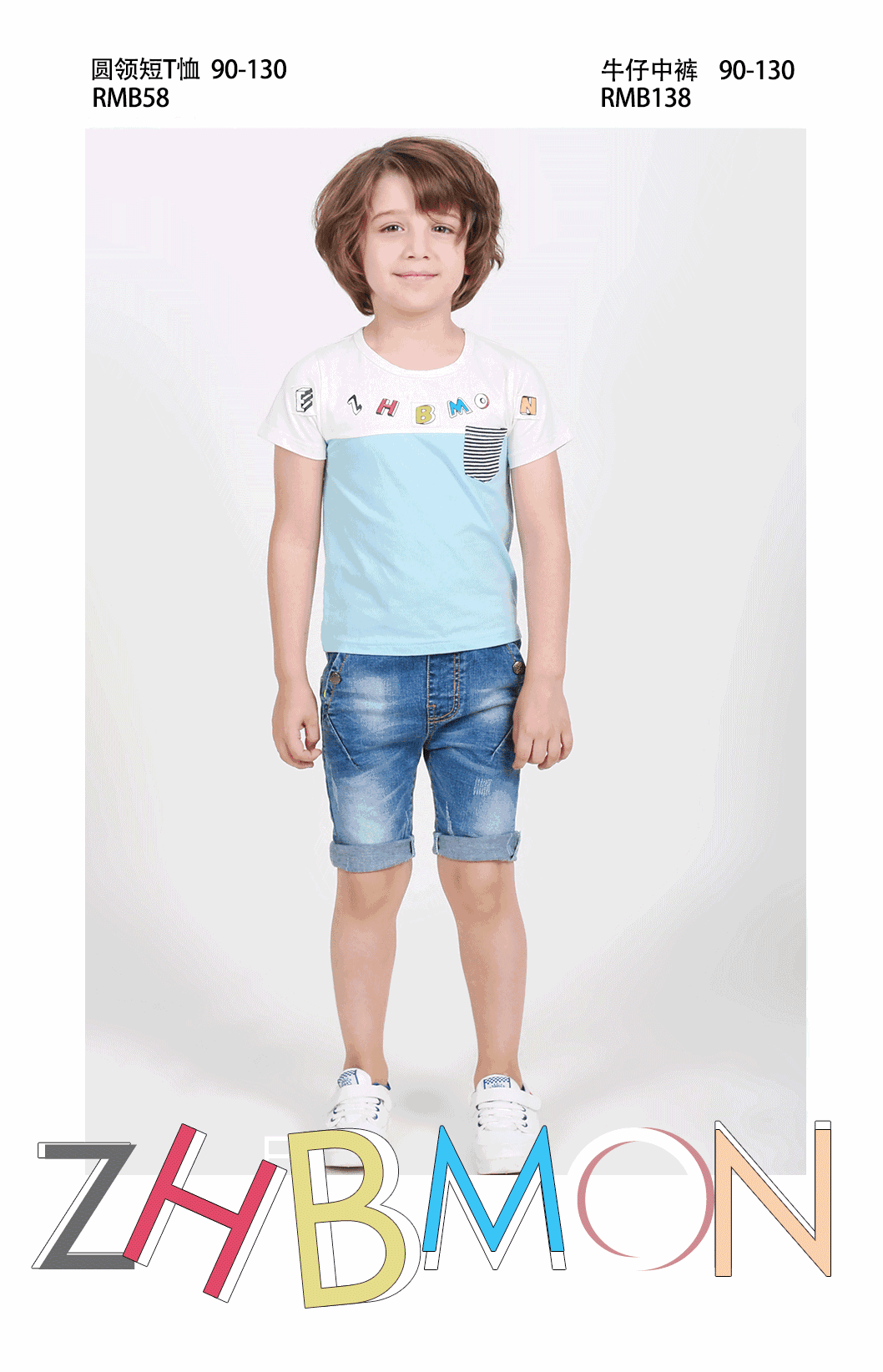 圆领短T恤搭配牛仔中裤,配搭小白鞋,颜色采用简洁的天蓝和白色搭配,配上立体字母,童趣无限,可爱,童真........。