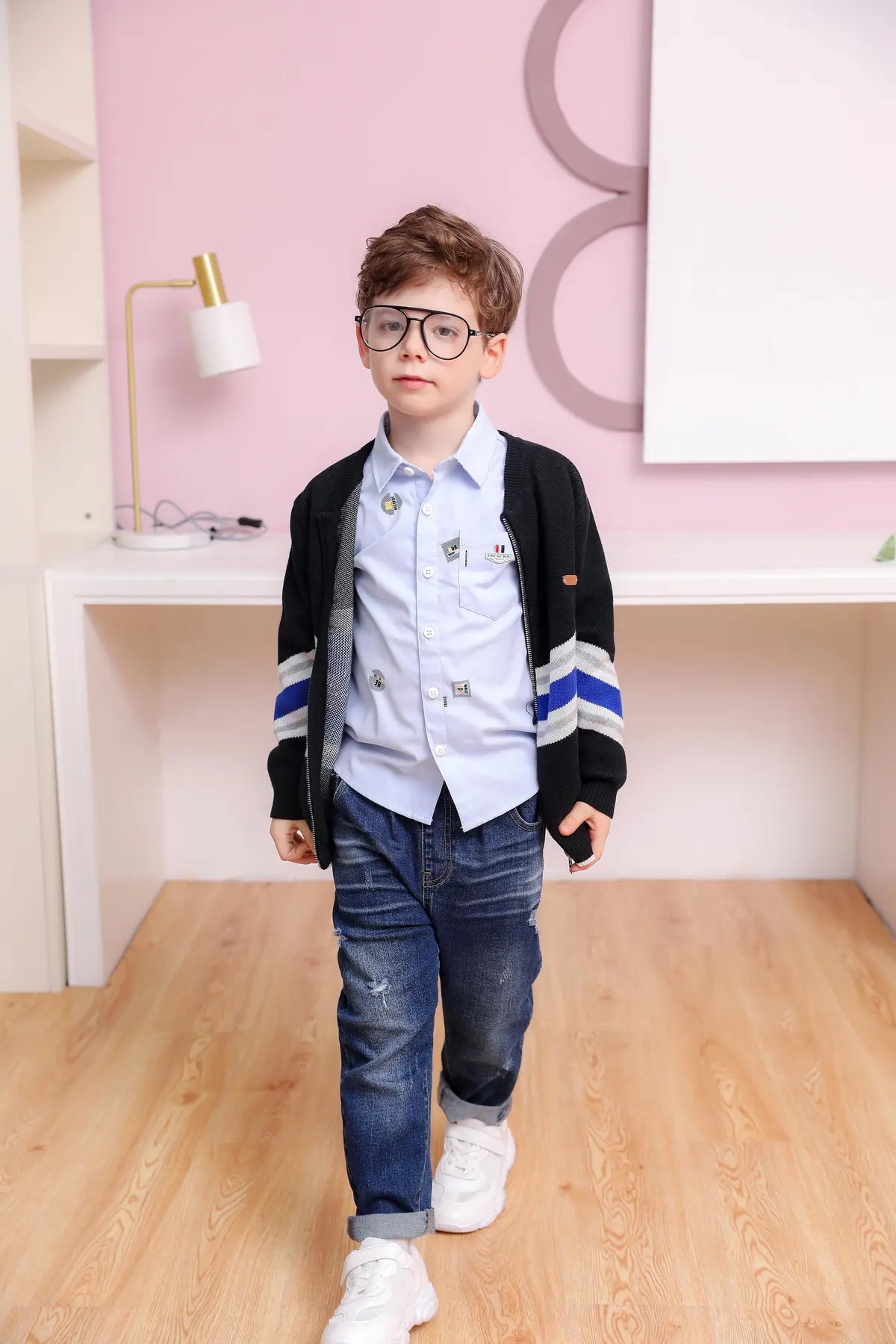 时尚童装选择纯正的颜色是出彩的第一步,而白色又足以衬托任何颜色,两种颜色足以搭配出时尚童装的服饰来。黑与白才是真色彩,造型干净利落,帅气十足。