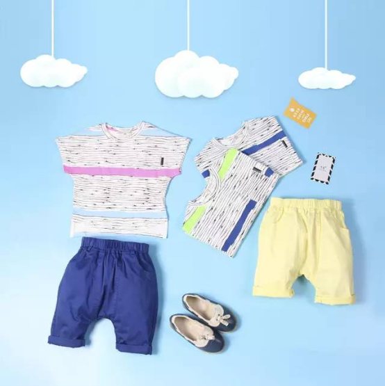 蓝天夏日,条纹短袖配上纯色小短裤突出凉爽夏日气息,面料柔软亲肤,透气舒适,短袖T恤为百搭款,纯色短裤搭上色条短袖,可以更好凸显孩子肤色。