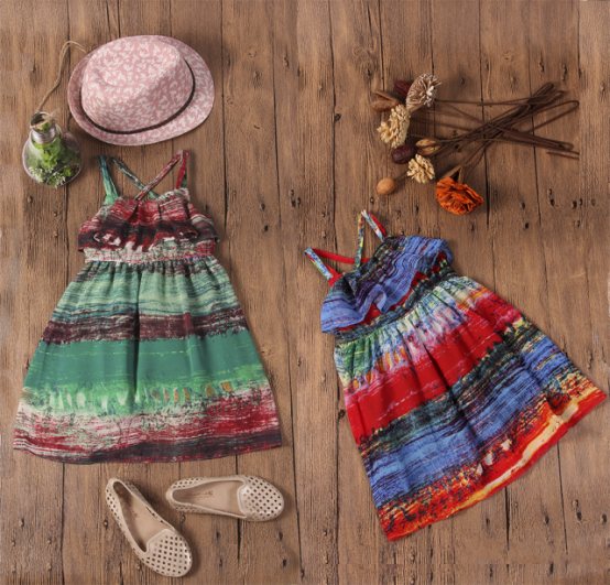 缤纷的印花,让宝贝瞬间化身花仙子。吊带露肩,穿着清凉舒适。花色连衣裙,跟夏季更配哟!